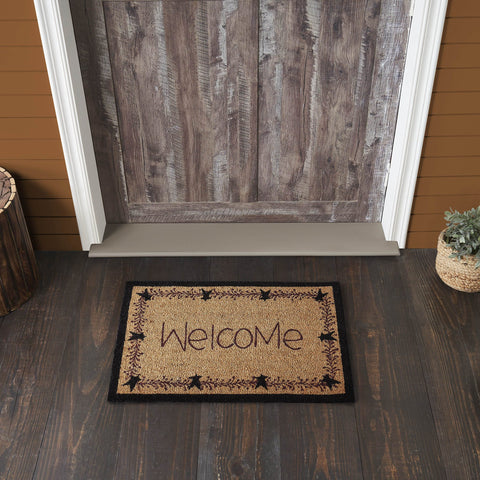 Welcome guests with a festive touch using the VHC Brands Patriotic Stars Welcome Coir Welcome Rug Rect 20x30. This charming doormat features five-point stars in vibrant shades of merlot and country blue, surrounding the warm Welcome greeting set against a natural tan base. Accented with a bold red border, this rug embodies Americana style, making it a perfect addition for...
