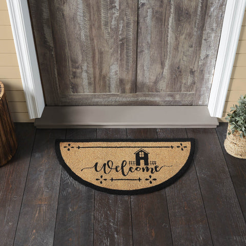 Welcome guests with rustic charm using the VHC Brands Saltbox Coir Welcome Rug Half Circle 16.5x33. This beautifully crafted doormat features a stenciled saltbox house and fence alongside a warm Welcome greeting, all in country black against a natural tan coir background. The design is framed by a subtle bar and droplet pattern, adding a unique decorative touch that perfectly...
