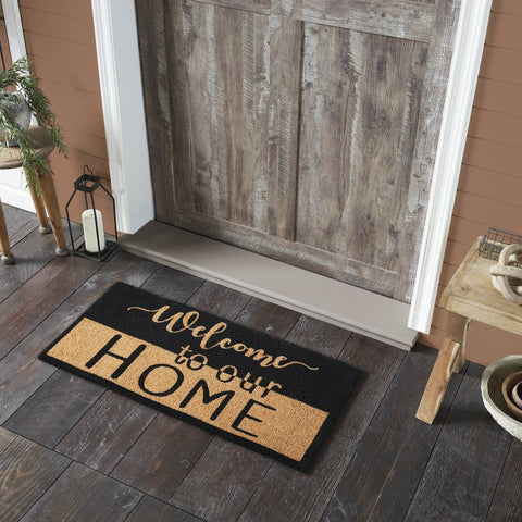 Welcome guests with rustic elegance using the VHC Brands Welcome To Our Home Black Tan Coir Welcome Rug Rect 17x36. This eye-catching door mat features a striking contrast design, with the warm greeting Welcome to our Home stenciled across a solid black upper portion and natural tan lower portion. Perfect for adding a touch of country homestead charm, this rug...