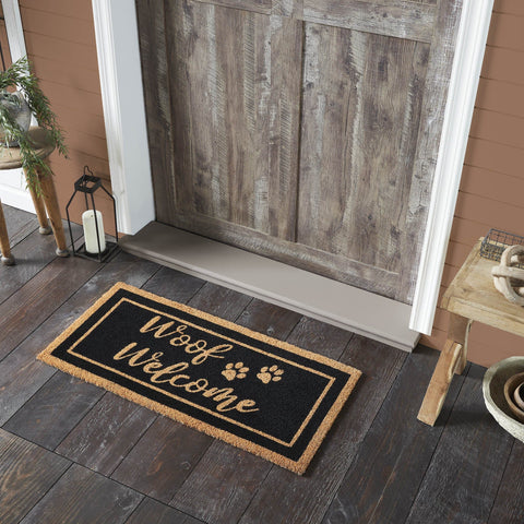 Welcome your furry friends and guests with the charming VHC Brands Woof Welcome Coir Welcome Rug Rect 17x36. Featuring the playful Woof greeting along with cute pupper paw prints and a Welcome message, this doormat is stenciled in natural tan on a deep black background. The rustic design is perfect for dog lovers and brings a fun, country-inspired touch to...