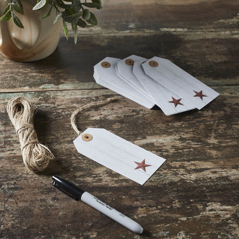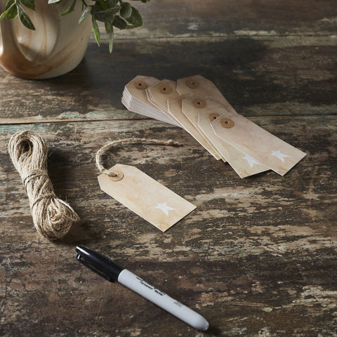 Introducing the VHC Brands Patriotic Primitive Star Tea Stained Paper Tags in a set of 50, each measuring 4.75x2.25, designed to infuse your Independence Day decor with a timeless primitive charm. Crafted from natural, rectangular paper tags featuring a navy printed primitive star, these tags showcase an American antique tea stain finish with a distressed appearance, adding character and authenticity....