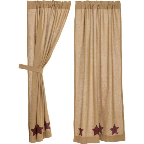 Burlap w/Burgundy Stencil Stars Short Panel Set features natural burlap with matching tie backs and a rod pocket that measures 3.25 inch in height which allows for a wide variety of hardware to be used.Features PREMIUM CONSTRUCTION: with over two decades experience crafting goods for American homes, our item are built to last for years to come. PRIMITIVE DECOR: traditional...