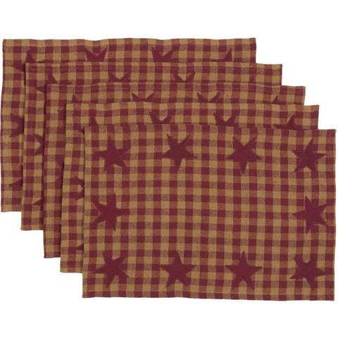 The Burgundy Star Placemat offers a timeless burgundy and tan check pattern and is beautifully decorated with burgundy appliqued 5 point stars.Features PREMIUM CONSTRUCTION: with over two decades experience crafting goods for American homes, our item are built to last for years to come. PRIMITIVE DECOR: traditional style that compliments any primitive or Americana home. QUALITY MATERIAL: made with durable...