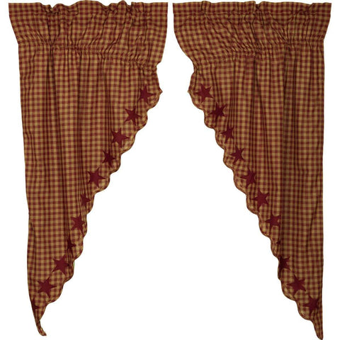 The Burgundy Star Scalloped Swag offers petite burgundy and tan checks with 5 Point stars appliqued along the scalloped edge in solid burgundy. Lined with luxurious white cotton.Features PREMIUM CONSTRUCTION: with over two decades experience crafting goods for American homes, our item are built to last for years to come. PRIMITIVE DECOR: traditional style that compliments any primitive or Americana...