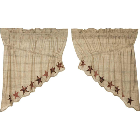 The Navy Star Scalloped Prairie Swag Set offers petite navy and tan checks with 5 Point stars appliqued along the scalloped edge in solid navy. Lined with luxurious white cotton.Features PREMIUM CONSTRUCTION: with over two decades experience crafting goods for American homes, our item are built to last for years to come. PRIMITIVE DECOR: traditional style that compliments any primitive...
