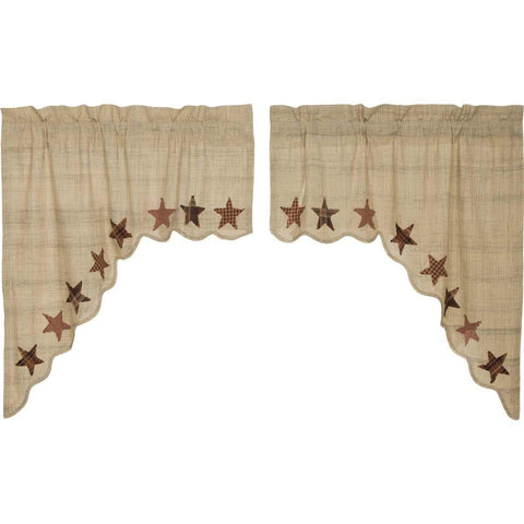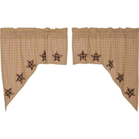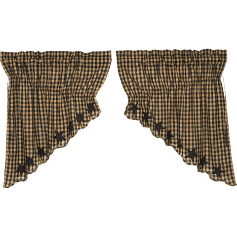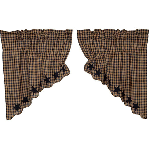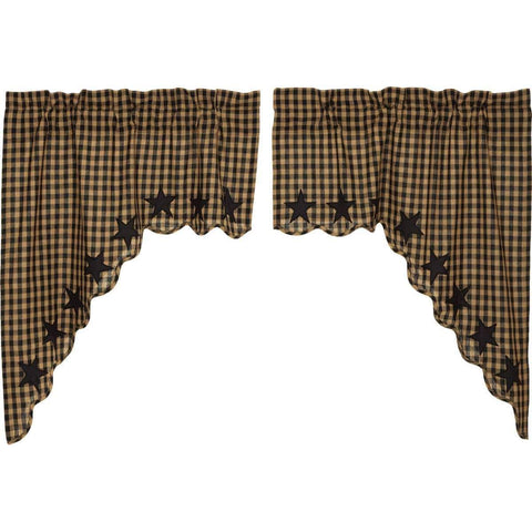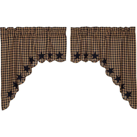The Black Star Scalloped Prairie Swag Set offers petite black and tan checks with 5 Point stars appliqued along the scalloped edge in solid black. Lined with luxurious white cotton.Features PREMIUM CONSTRUCTION: with over two decades experience crafting goods for American homes, our item are built to last for years to come. PRIMITIVE DECOR: traditional style that compliments any primitive...