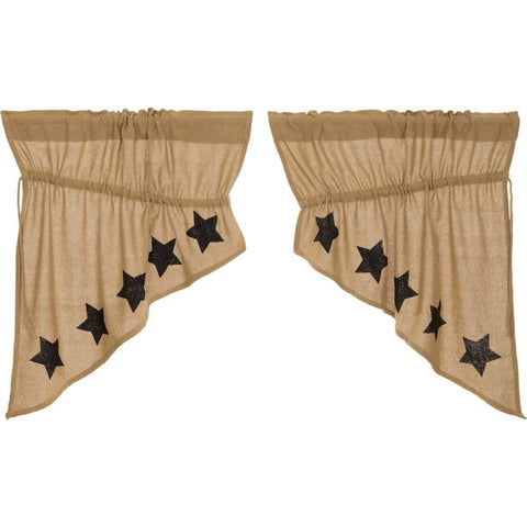 Burlap Natural Prairie Swag Black Stencil Stars Set is soft tan with bordered with black stenciled 5 point stars for a primitive, yet simple touch.Features PREMIUM CONSTRUCTION: with over two decades experience crafting goods for American homes, our item are built to last for years to come. PRIMITIVE DECOR: traditional style that compliments any primitive or Americana home. QUALITY MATERIAL:...
