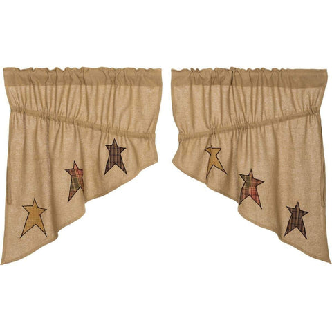 Bring the primitive look to any room with the Stratton Burlap Applique Star Prairie Swag Set. Constructed of cotton burlap and includes applique primitive stars in red, orange and yellow. Includes drawstring ties.Features PREMIUM CONSTRUCTION: with over two decades experience crafting goods for American homes, our item are built to last for years to come. PRIMITIVE DECOR: traditional style that...