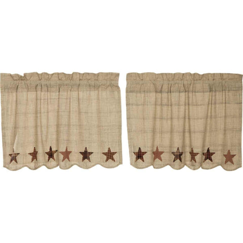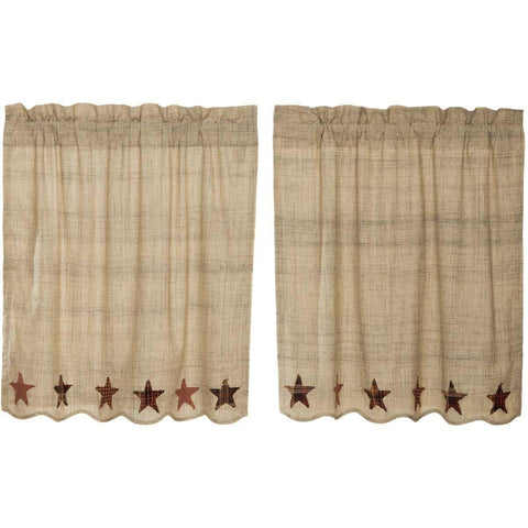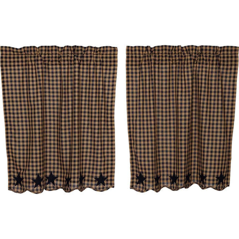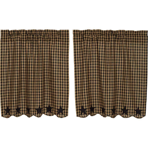 The Black Star Scalloped Tier Set L36xW36 offers charming small black and tan checks with 5 Point stars appliqued along the scalloped edge in solid black. Lined with luxurious white cotton.Features PREMIUM CONSTRUCTION: with over two decades experience crafting goods for American homes, our item are built to last for years to come. PRIMITIVE DECOR: traditional style that compliments any...