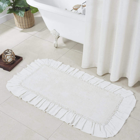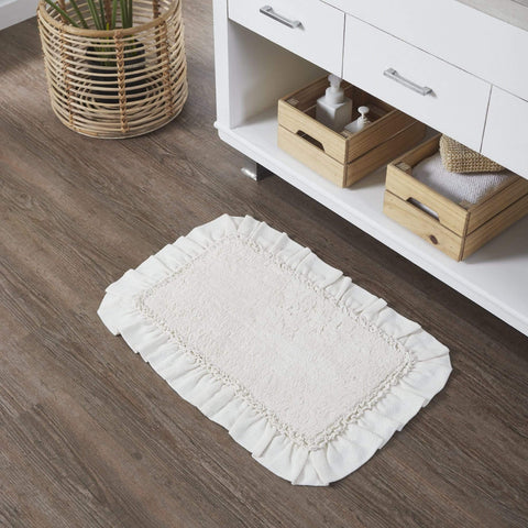 Add a country cottage flair to your bath or living space with this Burlap Antique White Bath Mat. This beautiful antique white 20x30 comfortable mat adds farmhouse charm to your decor. With a ruffled edge, ruched ruffle, and tufted weave, this solidly colored bath mat will find a place in your home for years to come. Reverses to a solid...