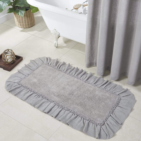 Add a country cottage flair to your bath or living space with the Burlap Dove Grey Bath Mat. This beautiful grey 27x48 comfortable mat adds farmhouse charm to your decor. With a ruffled edge, ruched ruffle, and tufted weave, this solidly colored bath mat will find a place in your home for years to come. Reverses to a solid tan...