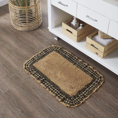Add country flair to your bath or living space with the Burlap Natural Black Check Bath Mat. This comfortable 27x48 mat showcases beautiful concentric hues of natural tan and raven black. With a ruffled edge, ruched ruffle, and tufted weave, this check bath mat will find a place in your home for years to come. Reverses to a solid tan...