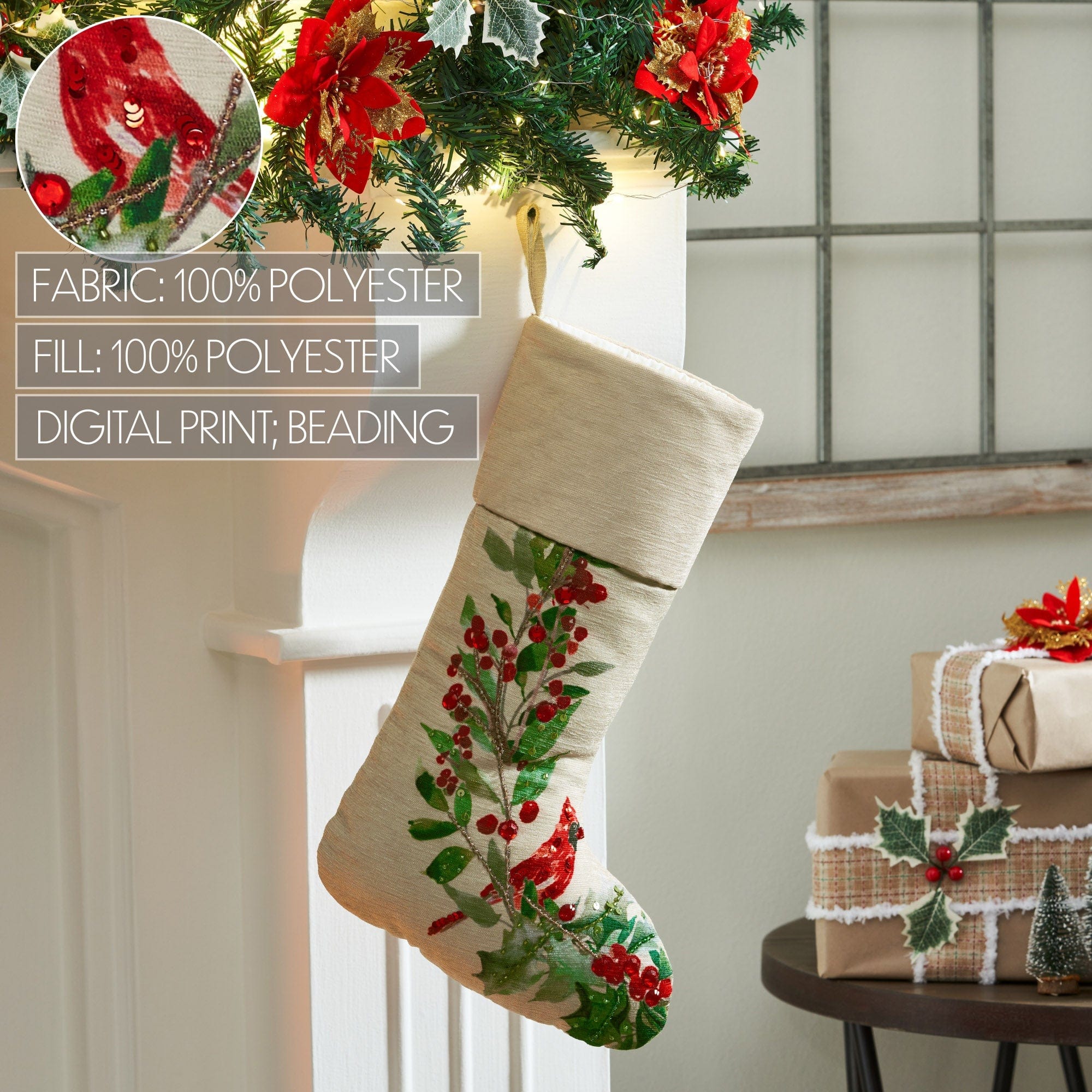 Add a festive touch to your holiday celebrations with the VHC Brands Cardinal Holly Stocking. Measuring 11x18 inches, this charming stocking features a soft creme fabric base adorned with a vibrant red cardinal perched gracefully on holly berry branches. The intricate bead trim detailing adds a subtle sparkle, enhancing its elegant and traditional Christmas appeal. Crafted from durable polyester, this decorative stocking is designed to bring warmth and charm to your mantel, staircase, or holiday display. The rich colors of dark green holly and bright Christmas red cardinal create a classic holiday palette, making it a perfect addition to farmhouse, rustic, or traditional seasonal decor. Its printed bird design adds a beautiful, nature-inspired accent to your festive setting. Ideal for use in any room-bathroom, bedroom, dining room, entryway, kitchen, or living room-the Cardinal Holly Stocking infuses your home with seasonal cheer. Spot clean only to maintain its beauty and keep it looking fresh year after year. Please note, this product is designed for decorative purposes only and is not suitable for children under 3 due to small parts. This stocking is a timeless holiday accent that celebrates the spirit of the season.