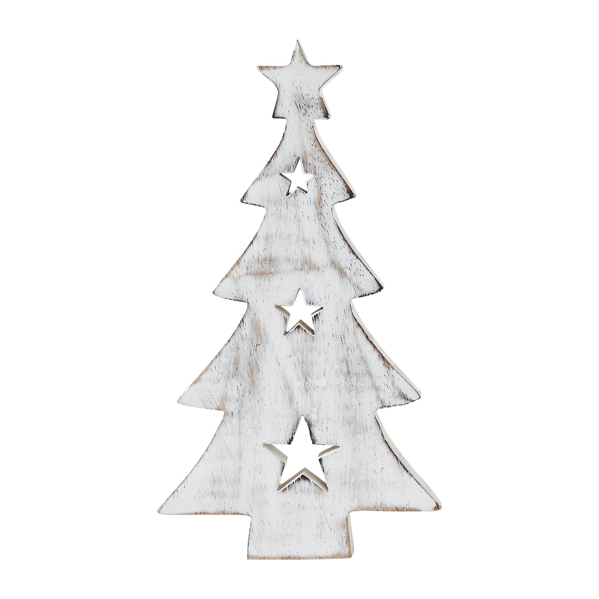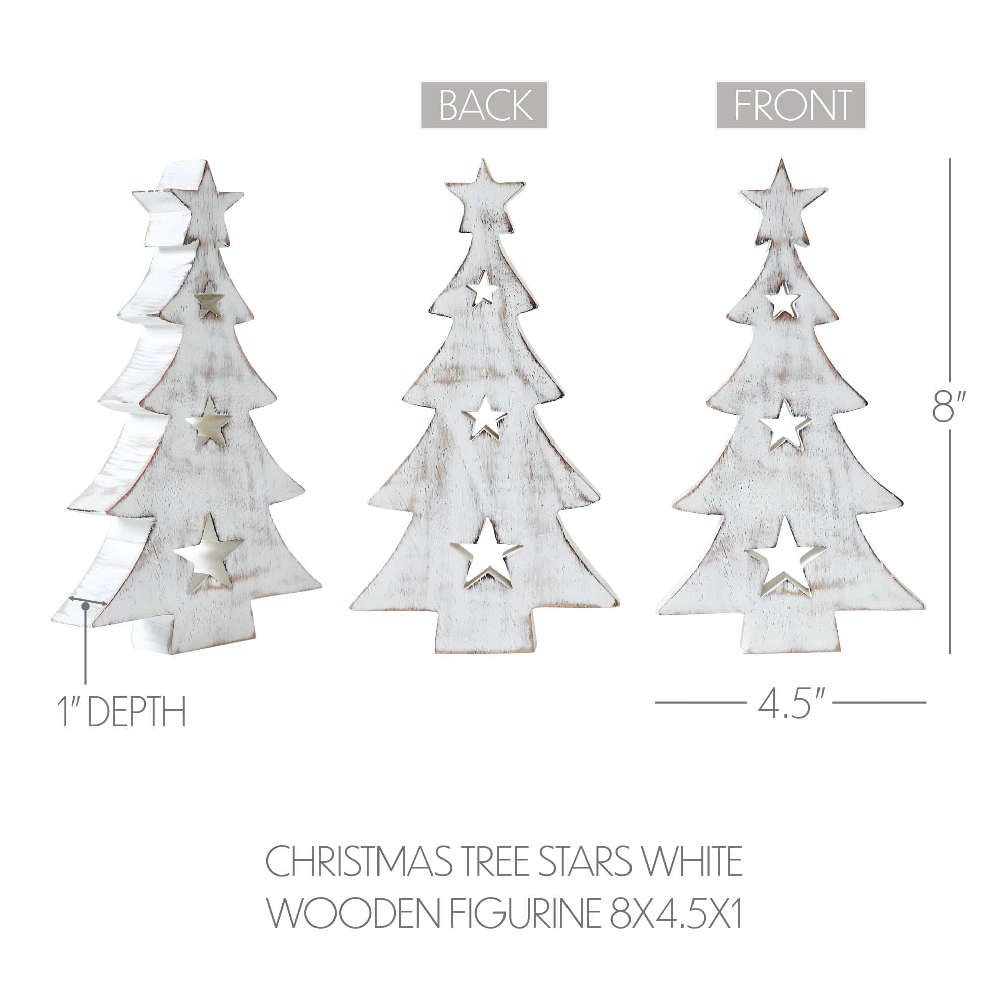 - Presenting the VHC Brands Tropical Wood Christmas Tree with Stars White Wooden Figurine, measuring 8x4.5x1 inches, a charming addition to your winter and Christmas home decor.