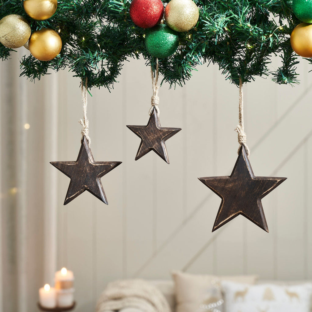 Add a timeless rustic touch to your holiday decor with the VHC Brands Dark Wooden Star Ornament Set of 3. Crafted from tropical wood, each ornament features a classic five-point star shape in a deep brown finish with light tan distressing that highlights the natural texture of the wood. This charming set includes three different sizes-4, 5, and 6 inches-perfect for creating visual variety on your tree or in a decorative display. With a weathered, vintage appearance, these wooden stars capture the essence of primitive Christmas style. The solid color palette and distressed detailing give them a handcrafted, heirloom feel that pairs beautifully with farmhouse, country, or traditional holiday themes. Whether used as ornaments, layered into a wreath, or tied to gift packaging, they bring a cozy, homespun look to your seasonal setup. Ideal for use throughout your home-from the living room and dining area to bedrooms and entryways-these ornaments offer versatile charm that complements any space. Easy to maintain with a quick wipe from a soft cloth, this durable set is made to be enjoyed year after year. Embrace the warmth and simplicity of rustic holiday decorating with this classic wooden star trio.