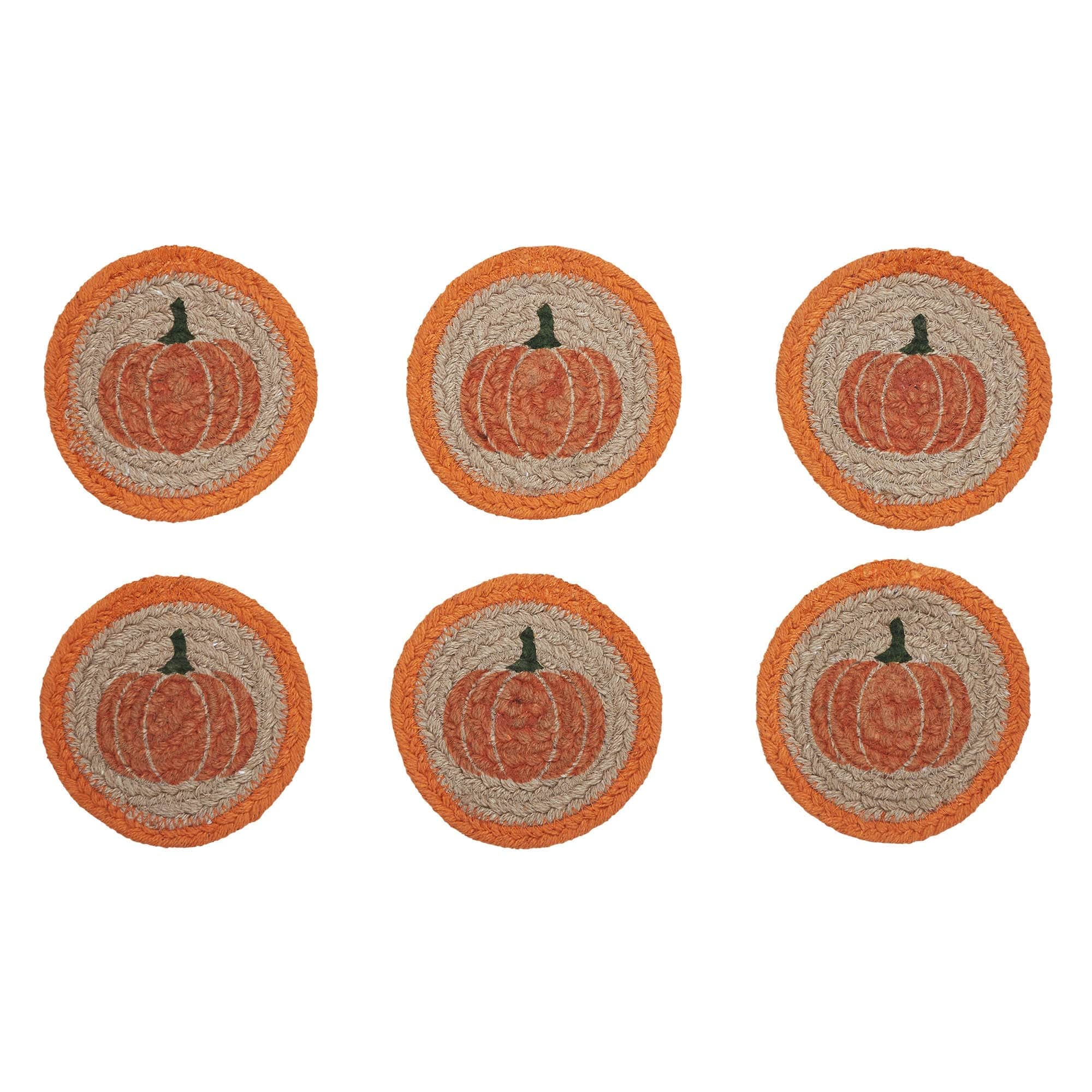 • Introducing the VHC Brands Harvest Blessings Natural Stencil Pumpkin Jute Coaster Set of 6, designed to elevate your fall, Thanksgiving, and Halloween table decor with its charming pumpkin-themed design and rustic appeal.