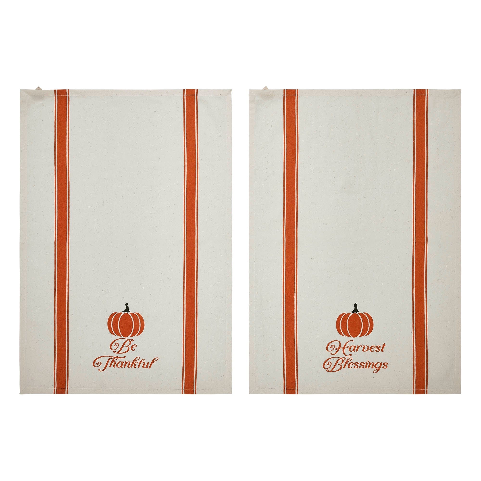 - Each tea towel in the set features a stenciled fall quote, with one towel displaying Be Thankful and the other Harvest Blessings adding a touch of seasonal inspiration to your kitchen decor.