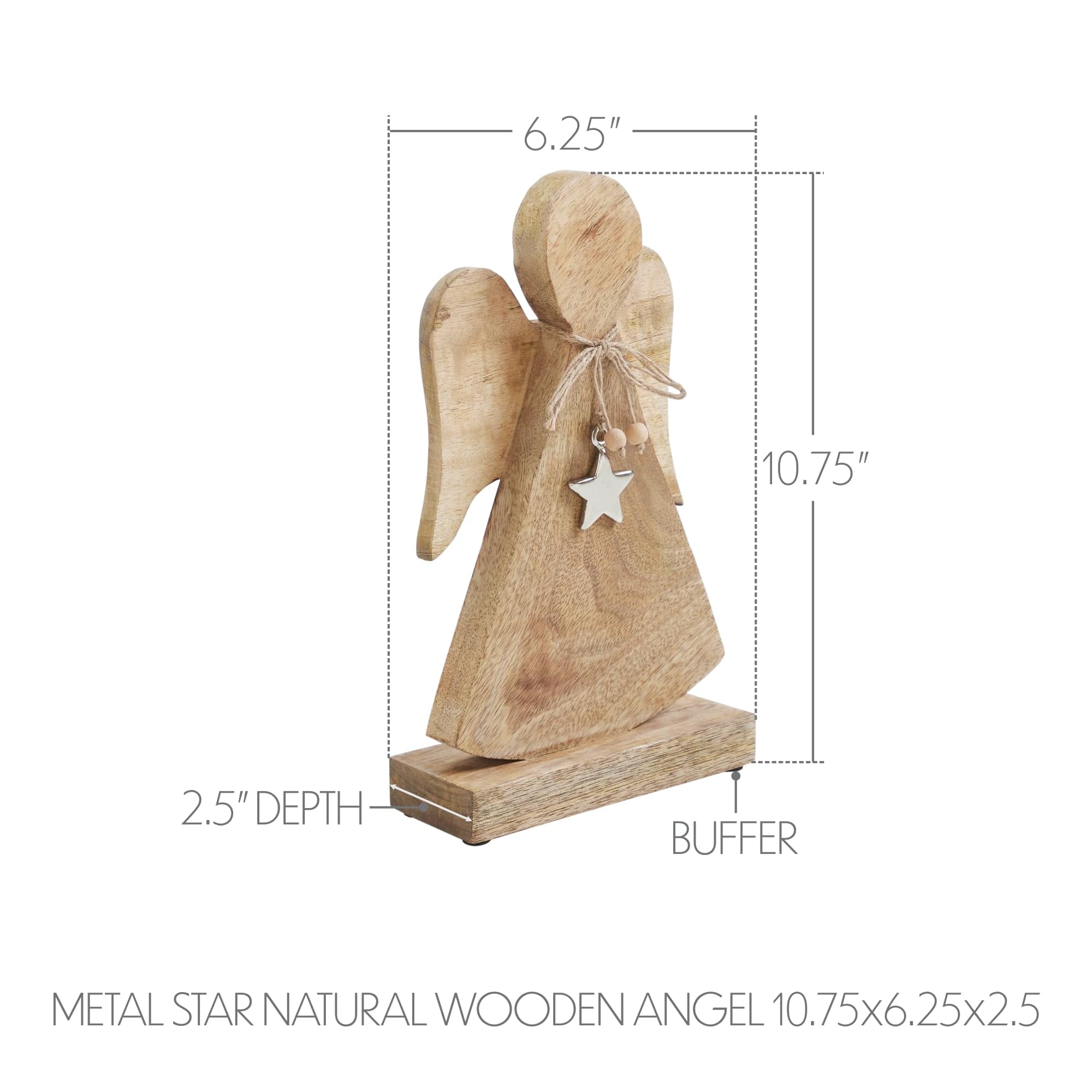 Add a serene and rustic touch to your holiday decor with the VHC Brands Metal Star Wooden Angel. Measuring 6.25x10.75 inches, this charming figurine features a natural wood tan silhouette of an angel with gracefully cut wings. The warm wood tone and simple design bring a peaceful, handcrafted feel to any Christmas or winter display. Accented with a twine bow and small wooden beads, this angel is further adorned with a delicate silver metal star, adding a subtle touch of shimmer and festive elegance. Mounted on a sturdy wooden base, it stands securely on mantels, shelves, or tabletops, making it a versatile addition to farmhouse, primitive, or traditional holiday themes. Its solid color and stained finish highlight the natural beauty of the wood. Perfect for display throughout your home-in the bathroom, bedroom, dining room, entryway, kitchen, or living room-the Metal Star Wooden Angel brings heartfelt charm and seasonal spirit to any space. Durable and easy to maintain, simply wipe clean with a soft cloth to preserve its rustic beauty year after year. This graceful piece is a meaningful addition to your Christmas collection.