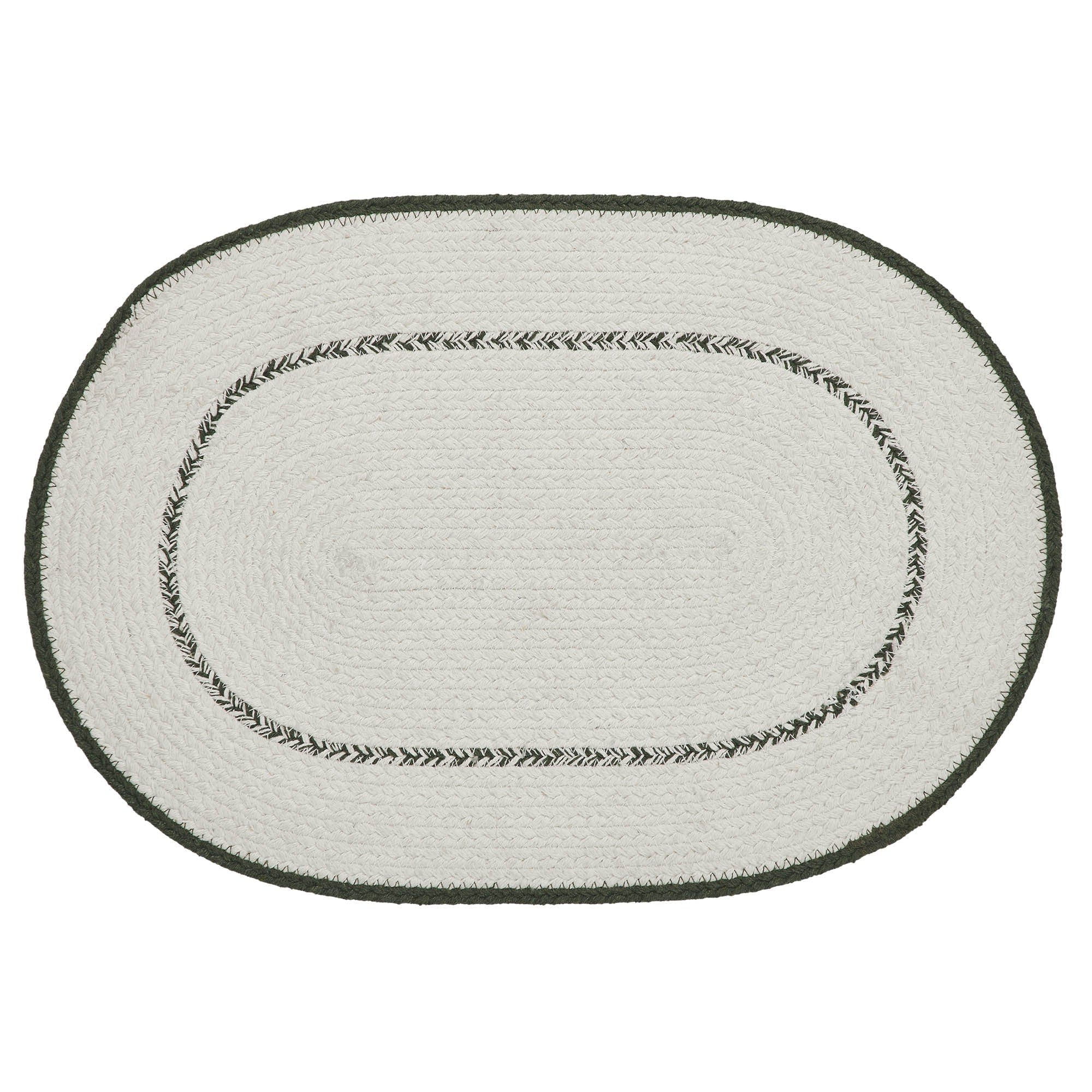 Elevate your autumn table decor with the charming VHC Brands Braided Cotton Pumpkin Bounty Oval Placemat Stencil. Crafted from a blend of cotton and polyester, this placemat offers both durability and softness, ensuring a cozy and inviting atmosphere for your fall and Thanksgiving gatherings. The oval shape and braided design add a touch of rustic elegance to your table setting, while the intricate stencil pattern featuring harvest pumpkins and vines in rich hues of burnt orange and cypress green brings the essence of the season into your home.Designed to celebrate the beauty of fall, this decorative placemat is the perfect addition to your dining room or kitchen decor. The graphic print of pumpkins and vines adds a festive flair to your table, creating a warm and welcoming ambiance for family meals and gatherings. Whether used as a standalone accent or paired with coordinating table linens, this placemat effortlessly enhances your fall tabletop with its country-inspired charm and stenciled detail. Easy to care for, the VHC Brands Braided Cotton Pumpkin Bounty Oval Placemat Stencil is hand washable, ensuring convenience and longevity. Its durable construction and timeless design make it a versatile piece that you can enjoy year after year. Add a touch of seasonal charm to your home decor and celebrate the bounty of fall with this delightful placemat, perfect for creating memorable moments with loved ones during the autumn season.