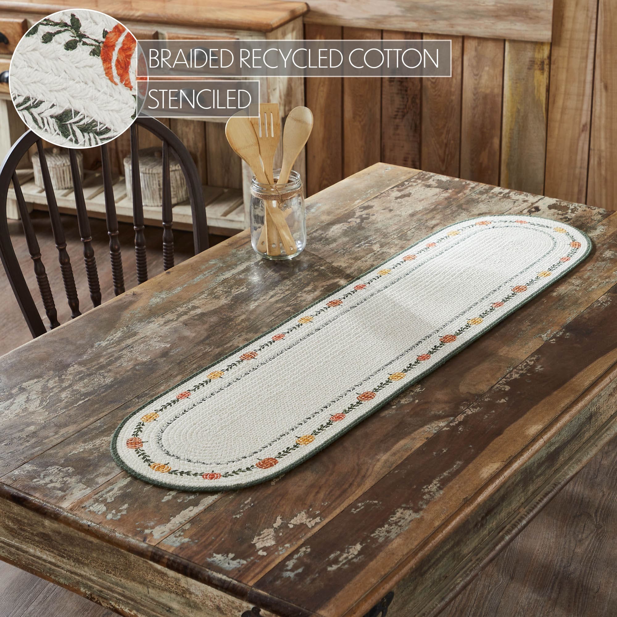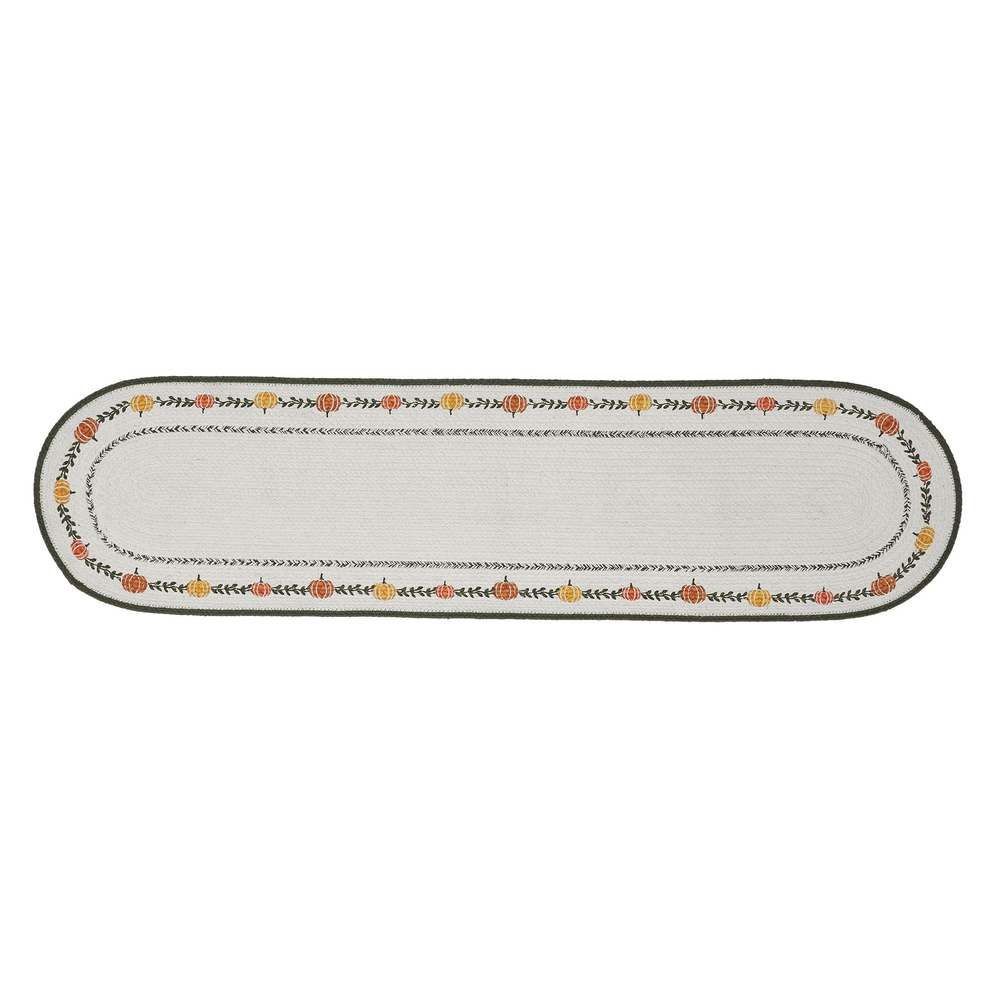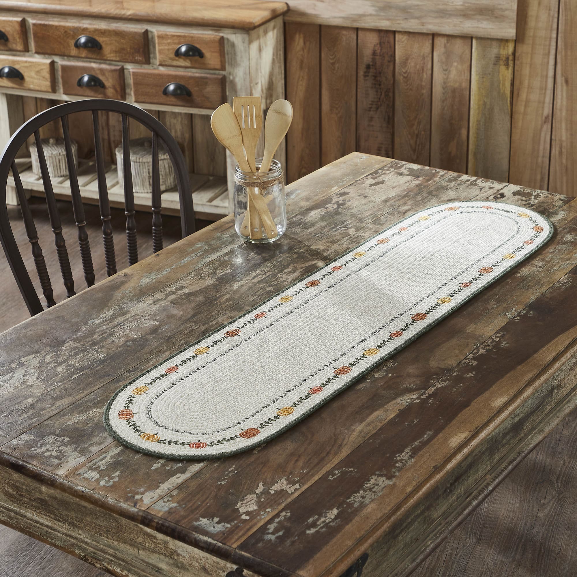 - Crafted from a blend of braided cotton, this oval table runner features a charming stencil design of harvest pumpkins and vines, offering a festive addition to your kitchen and dining table decor during the fall and Thanksgiving season.