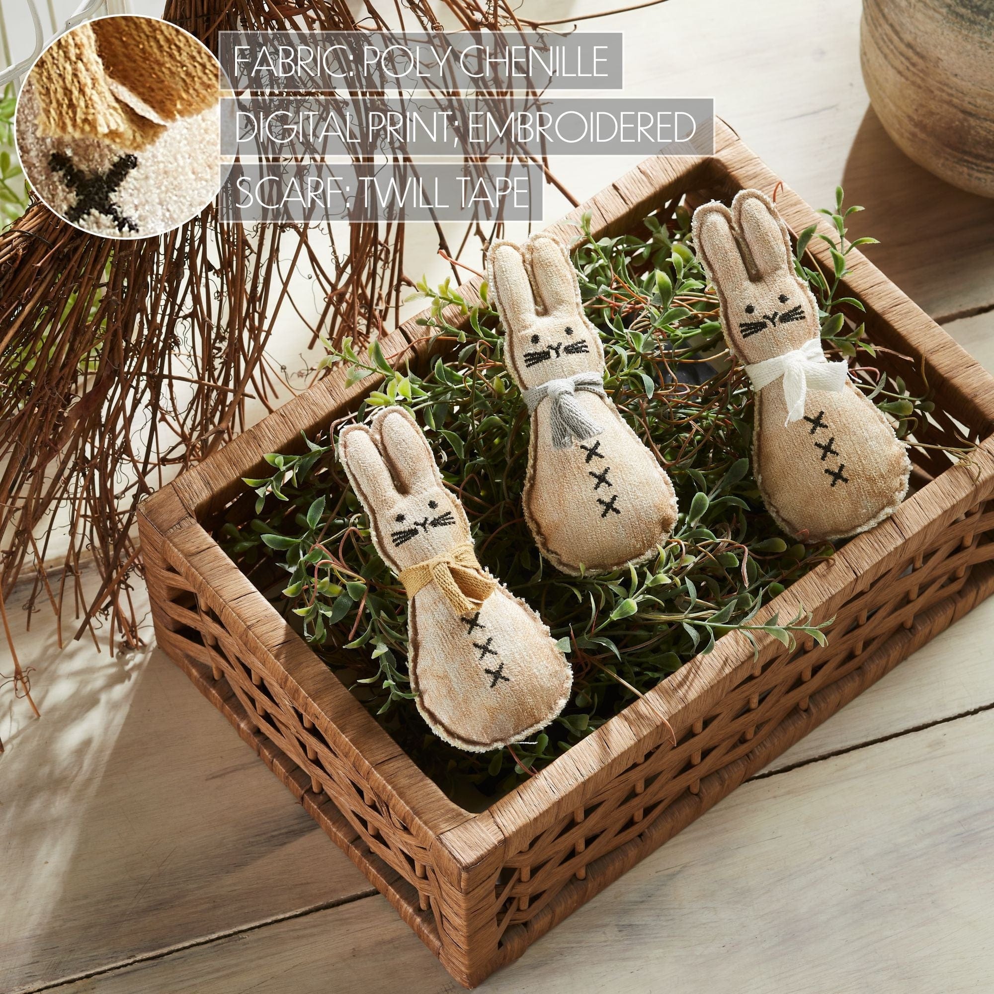 Introduce a touch of rustic charm to your spring and Easter decor with the VHC Brands Spring In Bloom Scarfed Primitive Bunny Fabric Ornament Set. This delightful set includes three mini bunny ornaments, each measuring 2.5x6 inches, crafted from a blend of polyester and cotton. The adorable bunnies feature a distressed tea stain style look, enhanced by embroidered details and a variety of spring-colored scarves. The antique white and rich black accents give these ornaments a timeless, primitive attic treasure appeal, making them a unique addition to your seasonal decorations. Perfect for adding a cozy, rustic touch to any room, these bunny ornaments are versatile enough to be displayed in the bathroom, bedroom, dining room, entryway, kitchen, or living room. Their primitive and mottled appearance blends seamlessly with farmhouse and country decor styles. Whether hanging on a decorative tree, adorning cabinet knobs, or incorporated into a spring wreath, these charming fabric bunnies bring a playful and inviting feel to your home. Maintaining the VHC Brands Spring In Bloom Scarfed Primitive Bunny Fabric Ornament Set is easy, requiring only spot cleaning to keep them looking fresh and vibrant. This simple care ensures that the ornaments remain a cherished part of your spring and Easter decor for years to come. Whether you're decorating your own home or looking for a thoughtful gift for loved ones, these scarfed primitive bunny ornaments add a touch of whimsy and warmth to any festive setting, celebrating the joy and renewal of the season.