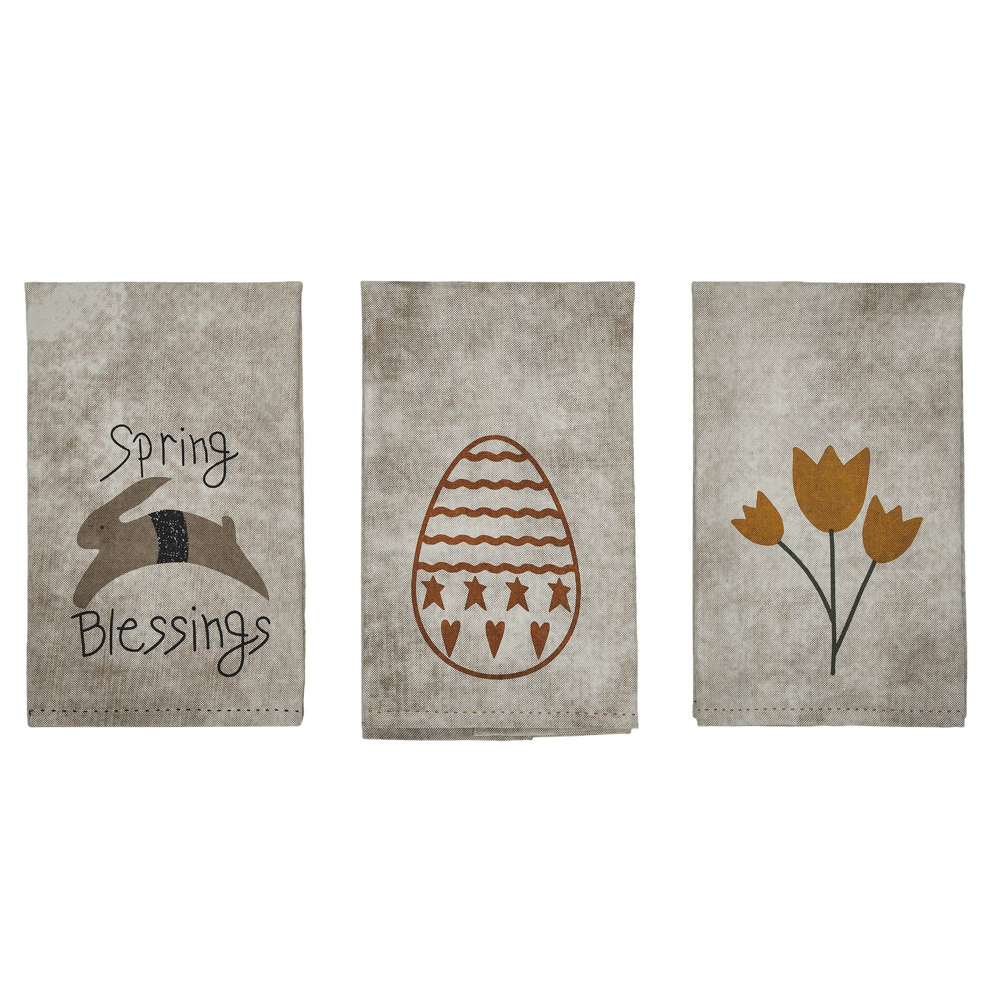 - Enhance your kitchen decor with the Spring In Bloom Collection Cotton Kitchen Towel set of 3. Featuring a primitive bunny and Spring Blessings, an Easter Egg and Flowers, embodying a Primitive Country style.