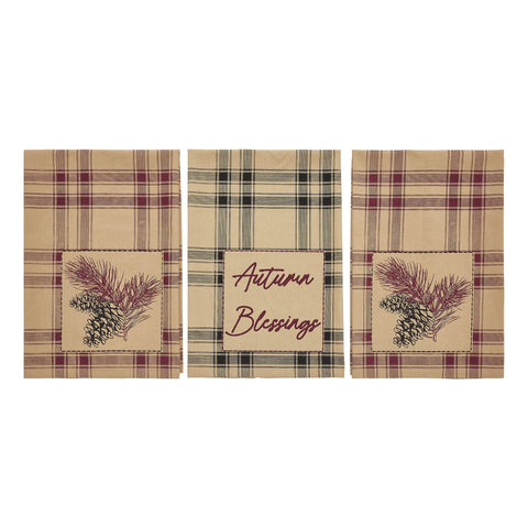 Add dark, fall charm to your primitive country kitchen with bold tones of black, burgundy and tan. The Connell Pinecone Tea Towel Set includes three unique tea towels measuring 19x28 inches each. The fall tea towels feature a tan base with striping for a plaid design. Two of the towels include burgundy stripes while the third includes soft black striping....