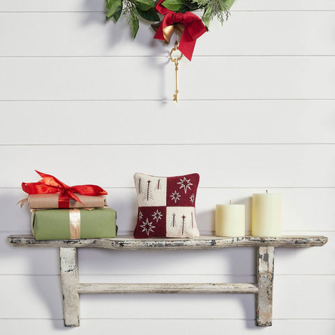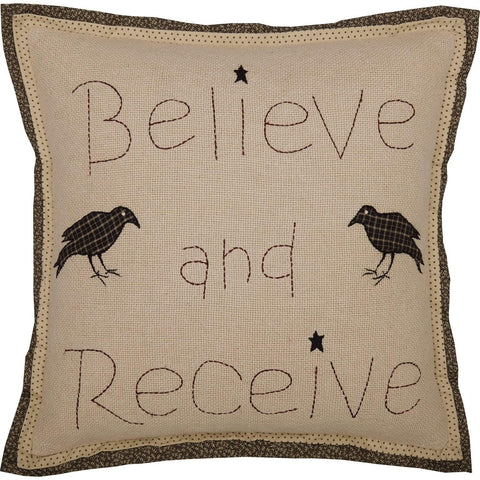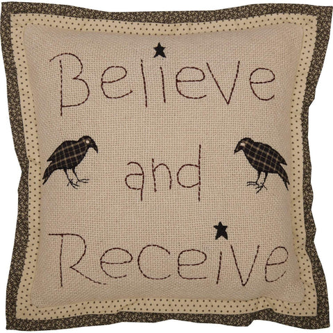 Decorate your home with a touch of warmth and old-fashioned essence this Christmas. The Kettle Grove Believe Receive Pillow adds simplicity and rustic charm to your home with beautifully embroidered "Believe and Receive" in burgundy on a vintage tan background surrounded by primitive crows designed in plaid. This filled pillow is finished with a solid tan base color and button...