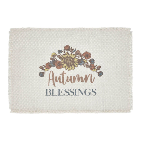 Add charming vintage style to your fall tabletop decor. The Bountifall Autumn Blessings Placemat set includes two matching placemats measuring 13x19 inches each. The fall place settings feature fringed fabric in a soft cream crafted with water-resistant recycled plastic. Each mat is decorated with a vintage-inspired floral design that highlights word art reading, Autumn Blessings. Hand wash and lay flat...