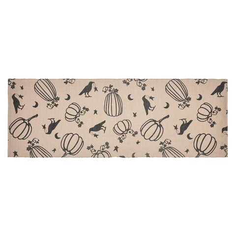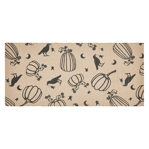 Welcome friends and family with modern fall style. The Raven Harvest Indoor/Outdoor Rug measures 17x48 inches and is constructed with recycled plastic for a textured and water-resistant surface that is perfect for entryways and kitchens. The deep tan fabric is accented with a caviar black pattern featuring printed pumpkins, ravens and stars with crescent moons for a festive fall design....