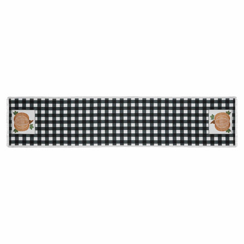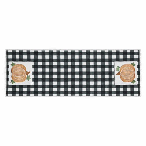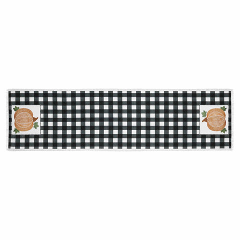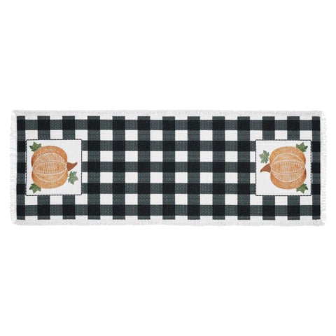 Give your tabletop decor a seasonal upgrade with checkered plaid and pumpkin accents. The Annie Black Check Pumpkin Runner measures 12 by 36 inches and features a black and white base in buffalo plaid surrounded by a soft, frayed edge. The left and right edges of the thanksgiving table runner feature a vintage-inspired pumpkin design in burnt orange with olive...