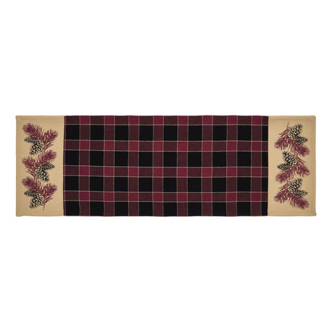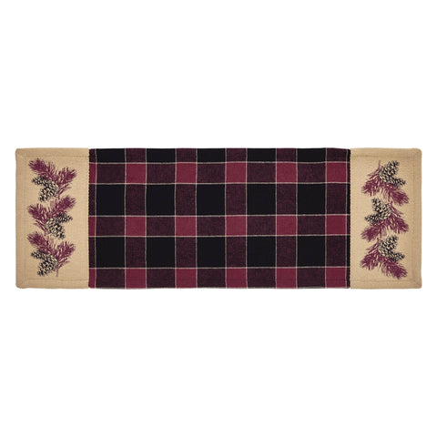 Give your tabletop decor a seasonal upgrade with traditional plaid in deep tones with pinecone accents. The Connell Pinecone Runner measures 8 by 24 inches and features a woven base in 100 percent cotton. The dark fall table runner features a burgundy and black plaid base flanked by tan blocks featuring a primitive pinecone and pine needle design. Machine wash...