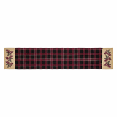Give your tabletop decor a seasonal upgrade with traditional plaid in deep tones with pinecone accents. The Connell Pinecone Runner measures 12 by 60 inches and features a woven base in 100 percent cotton. The dark fall table runner features a burgundy and black plaid base flanked by tan blocks featuring a primitive pinecone and pine needle design. Machine wash...