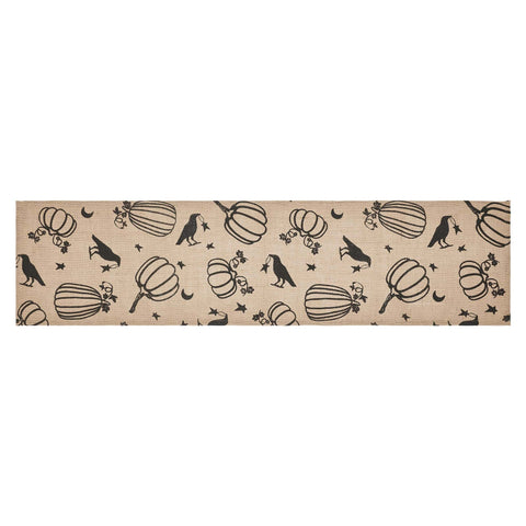 Give your tabletop decor a seasonal upgrade with rustic burlap and a primitive fall design. The Raven Harvest Burlap Jute Runner measures 12 by 60 inches and features a woven burlap base in natural tan. The textured Thanksgiving table runner features a whimsical pattern with stenciled black pumpkins, crows, stars and crescent moons. Hand wash and lay flat to dry....