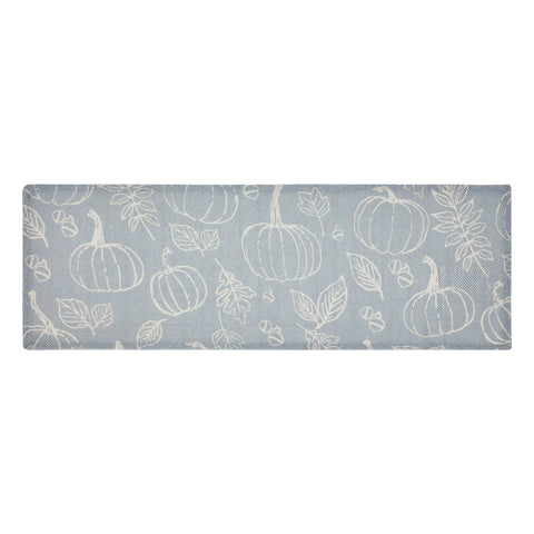Welcome friends and family with modern fall style. The Silhouette Pumpkin Grey Rug measures 17x48 inches and is constructed with recycled plastic for a textured and water-resistant surface that is perfect for entryways and kitchens. The deep grey fabric is accented with a cream pattern featuring printed pumpkins, leaves and acorns for a festive fall design. Features Fall Area Rug...