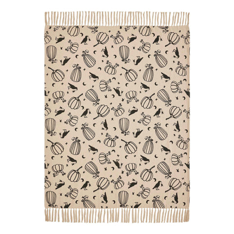 Warm, primitive style gets a spooky season makeover with a charming print featuring pumpkins and ravens on a field of stars and crescent moons. The Raven Harvest Throw measures 50x60 inches and is crafted with recycled cotton in a natural tan color. The fall throw blanket is edged with long tassels that perfectly frame a bold fall pattern in black....