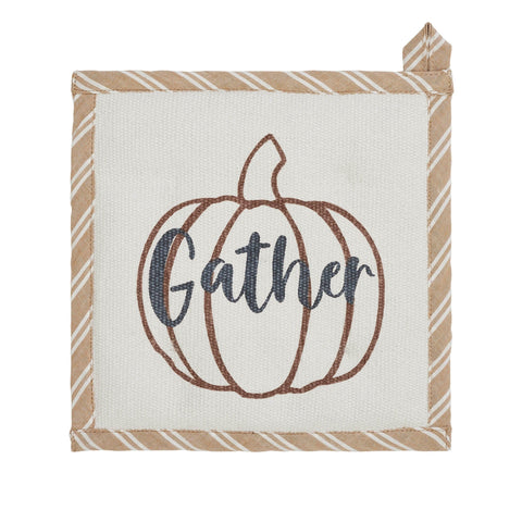 Add charming vintage style to your fall kitchen decor. The Bountifall Pumpkin Gather Trivet set includes three matching trivets measuring 8x8 inches each. The small kitchen pads feature striped fabric in a deep gold. The front of the trivets features simple creme fabric with a pumpkin print in burnt orange. Word art reads, Gather in a soft blue shade that...