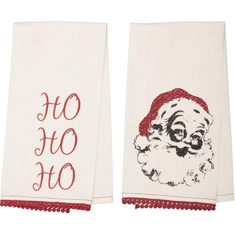 Bring a dash of holiday spirit into your kitchen this year with the Chenille Ho Ho Ho Natural Muslin Tea Towel Set. Featuring an antique creme background with beautifully embroidered "Ho Ho Ho" on one towel and a vintage Santa stenciled on the other. Finished with a cherry red pom pom lace to add a trendy detail and fun design....