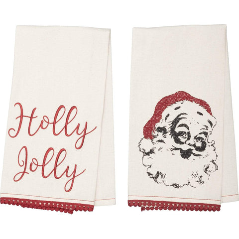 Bring a dash of holiday spirit into your kitchen this year with the Chenille Holly Jolly White Muslin Tea Towel Set. Featuring a soft white background with beautifully embroidered "Holly Jolly" on one towel and a vintage Santa stenciled on the other. Finished with a cherry red pom pom lace to add a trendy detail and fun design. Hang this...