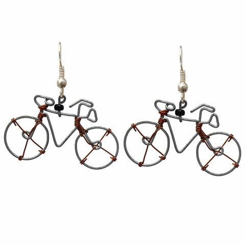 Shaped from recycled silver metal and copper wire, these bicycle earrings are approximately 1.5 inches wide and have a single glass bead near the hook. Bead colors will vary. Set of 10. Thank you for shopping The Village Country Store, authorized dealer for VHC Brands, Victorian Heart Quilts inc., and Fair Trade Artisan Gifts and Crafts.