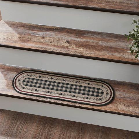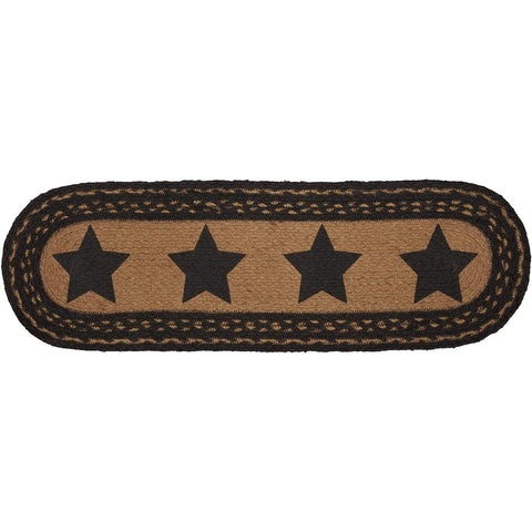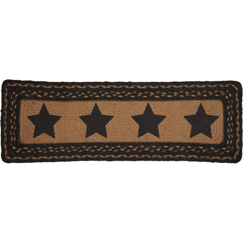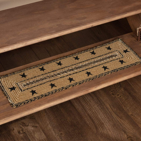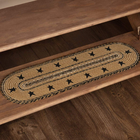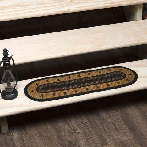 Decorate your stairs with the primitive Kettle Grove Jute Stair Tread Stencil Stars Border, Oval 8.5x27. This stair tread is decked out in a beautiful, timeless, primitive style, featuring alternating braids in black, warm creme and soft caramel brown, surrounded by black stenciled primitive stars. Finished with latex on the back for non slippage.Features PREMIUM CONSTRUCTION: with over two decades...