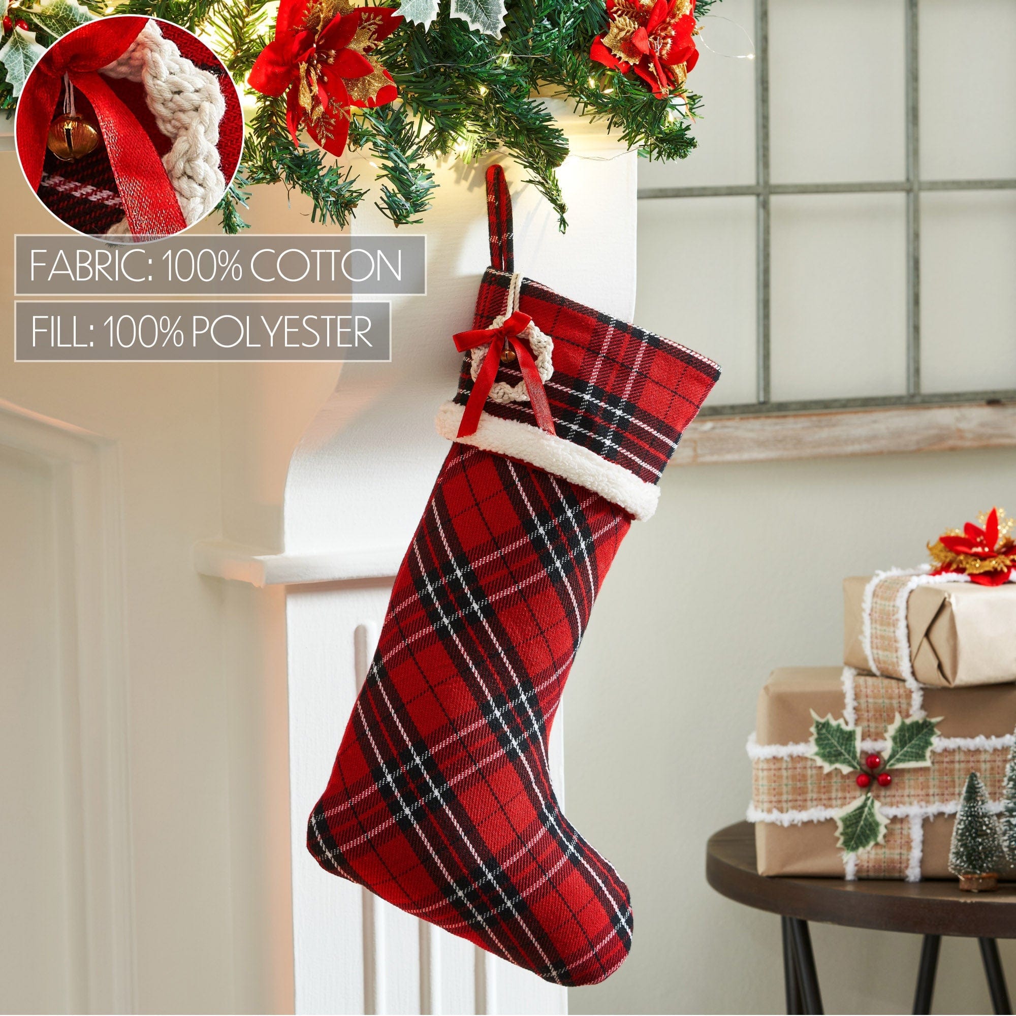 Bring timeless holiday charm to your decor with the VHC Brands Tartan Plaid Stocking. Measuring 11x18 inches, this traditional stocking features a classic tartan plaid pattern in deep red, country black, and white. Its rich colors and iconic design evoke cozy winter evenings and festive gatherings, making it a perfect addition to any Christmas mantel or holiday display. Crafted from soft, durable cotton, this stocking offers both style and substance. The traditional plaid pattern lends a warm, rustic feel that complements farmhouse, classic, and country Christmas themes. Whether hung on the mantel, staircase, or your favorite holiday nook, it adds a touch of nostalgic elegance and seasonal spirit to your home. Ideal for use in any room-bathroom, bedroom, dining room, entryway, kitchen, or living room-the Tartan Plaid Stocking brings festive warmth and style throughout your holiday space. Spot clean only to maintain its vibrant colors and quality. Please note, this product is designed for decorative purposes only and is not suitable for children under 3 years due to small parts. This stocking is a classic holiday accent that will be cherished for years to come.