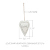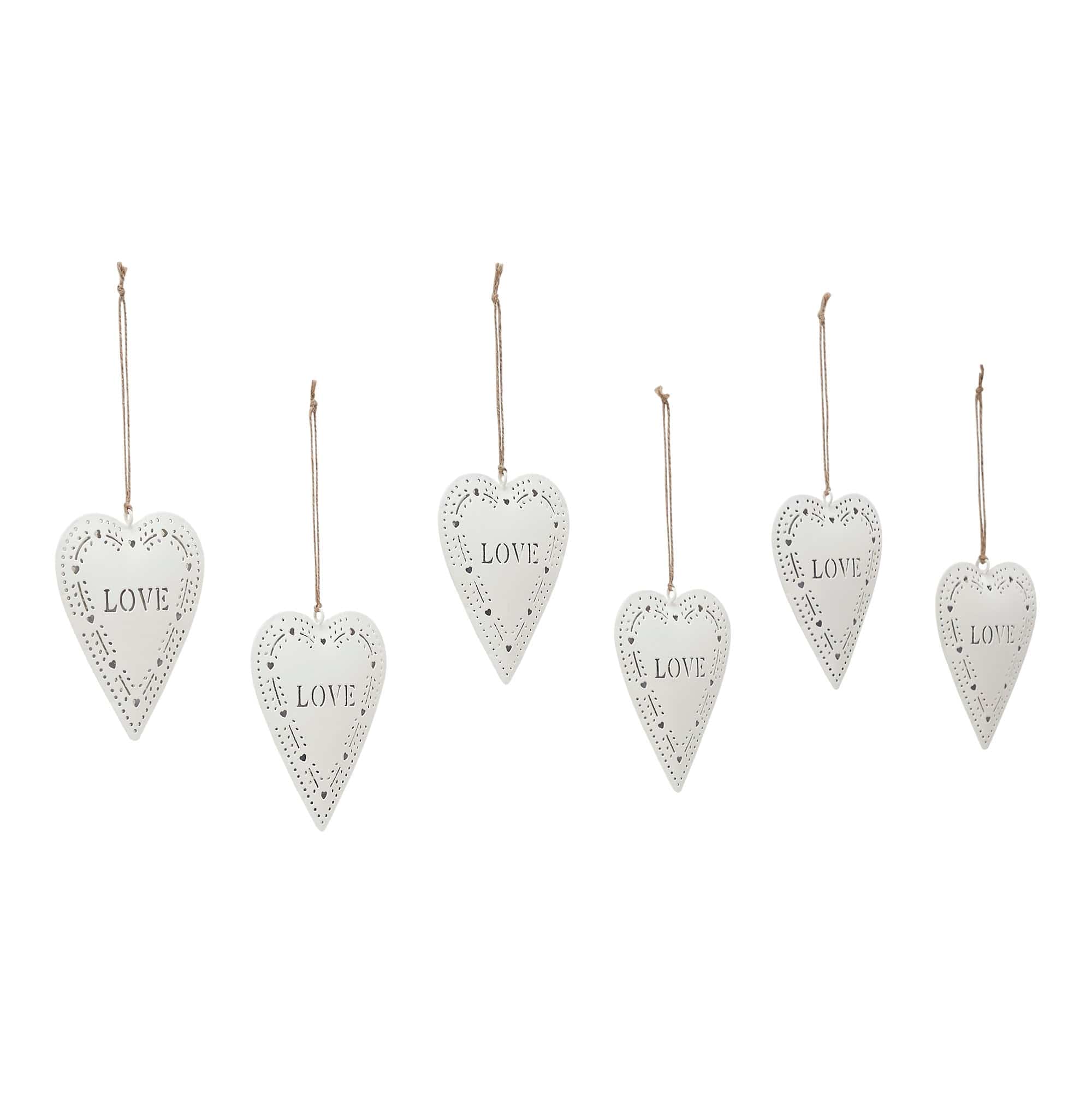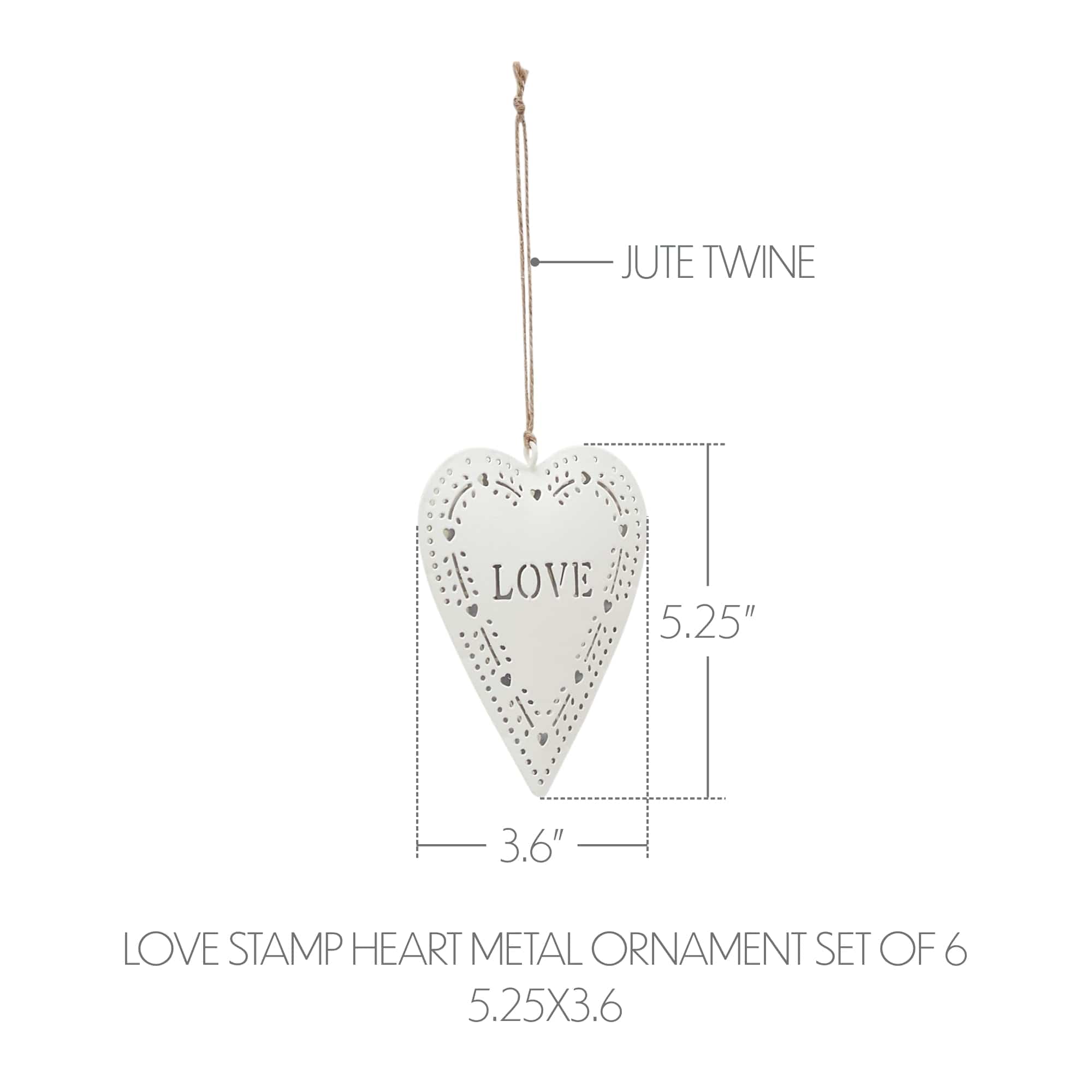 Bring heartfelt charm to your holiday decor with the VHC Brands Love Stamp Heart Metal Ornament Set of 6. Made from sturdy iron, each heart-shaped ornament is finished in a soft Christmas white and features a die-cut design with the word Love at the center, surrounded by a delicate vine heart pattern along the edge. A twine hanger adds a rustic touch, making these ornaments perfect for primitive and country-inspired holiday themes. The elegant cutout detail and solid color give these ornaments a timeless, handcrafted look that blends seamlessly with both classic and minimalist Christmas decor. Whether hung on a tree, strung along a garland, or used to accent a holiday centerpiece, these hearts bring warmth and meaning to any festive setting. Their lightweight design makes them easy to display throughout your home. Perfect for the bathroom, bedroom, dining room, entryway, kitchen, or living room, this set of six ornaments offers versatile and heartfelt holiday style. The gentle white finish and love-themed design make them not only decorative but also symbolic of the season's spirit. For lasting beauty, simply wipe clean with a soft cloth.