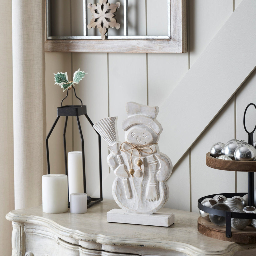 • Smiling Snowman Design: Features a cheerful wooden snowman complete with a top hat and scarf, painted in white with a distressed finish, adding a warm, festive touch to your Christmas and winter decor.