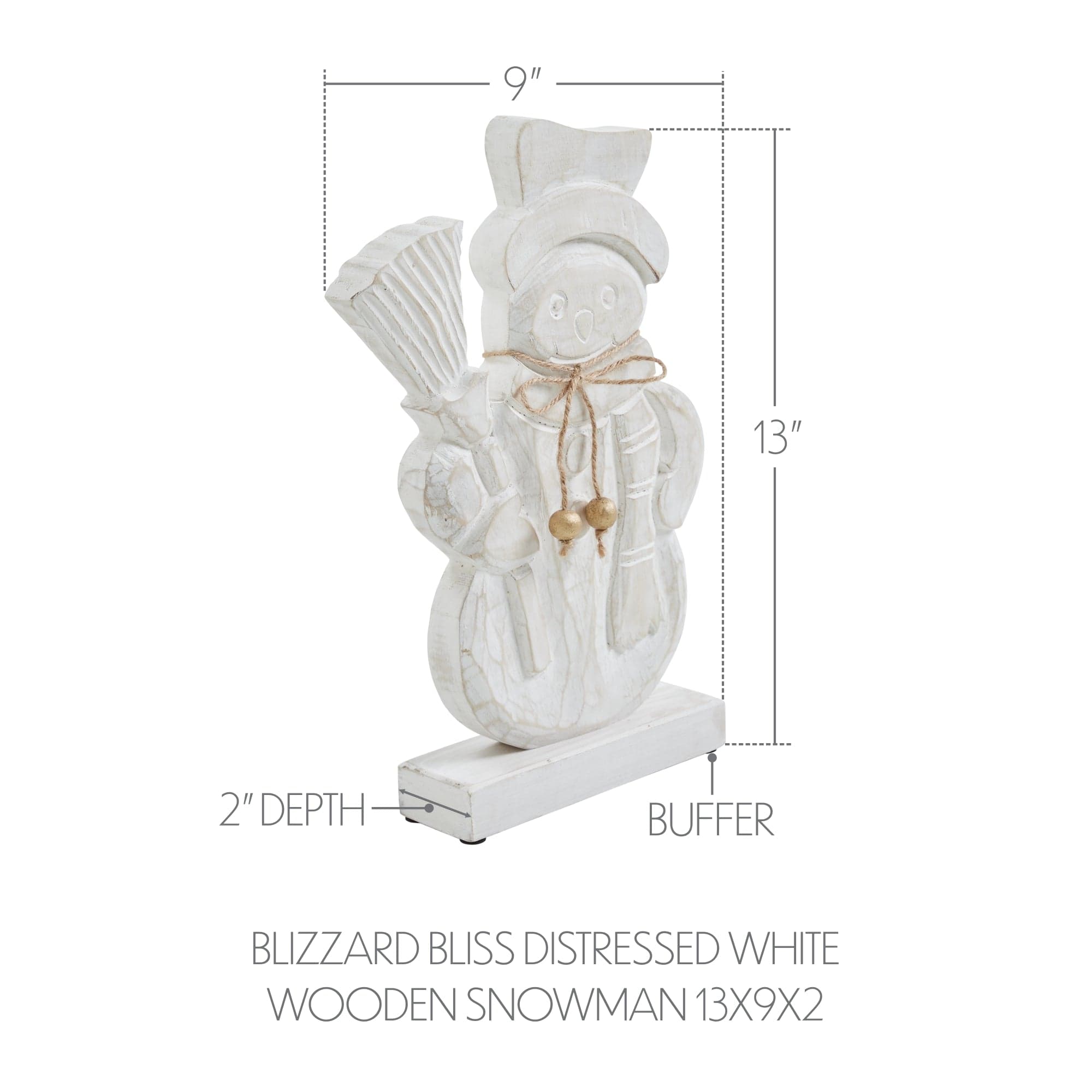 Bring a joyful and rustic charm to your holiday decor with the VHC Brands Blizzard Bliss Distressed Wooden Snowman. Standing 9x13 inches, this delightful figurine features a smiling snowman adorned with a classic top hat and scarf, all crafted from tropical wood and finished in a soft whitewash. The light tan distressing adds a vintage, weathered look that perfectly captures the warmth and whimsy of the winter season. Accented with a twine bow and gold-painted wooden beads, this snowman exudes handcrafted country charm. Mounted on a sturdy wood base, it stands securely on mantels, shelves, or tabletops, making it a versatile piece for farmhouse, rustic, or traditional holiday settings. Its solid color palette and detailed painting provide a timeless appeal that blends effortlessly with your existing seasonal decor. Perfect for display throughout your home-in the bathroom, bedroom, dining room, entryway, kitchen, or living room-the Blizzard Bliss Distressed Wooden Snowman brings festive cheer and cozy warmth to any space. Easy to care for with a simple wipe from a soft cloth, this charming figure is built to last and will become a beloved part of your winter collection year after year.