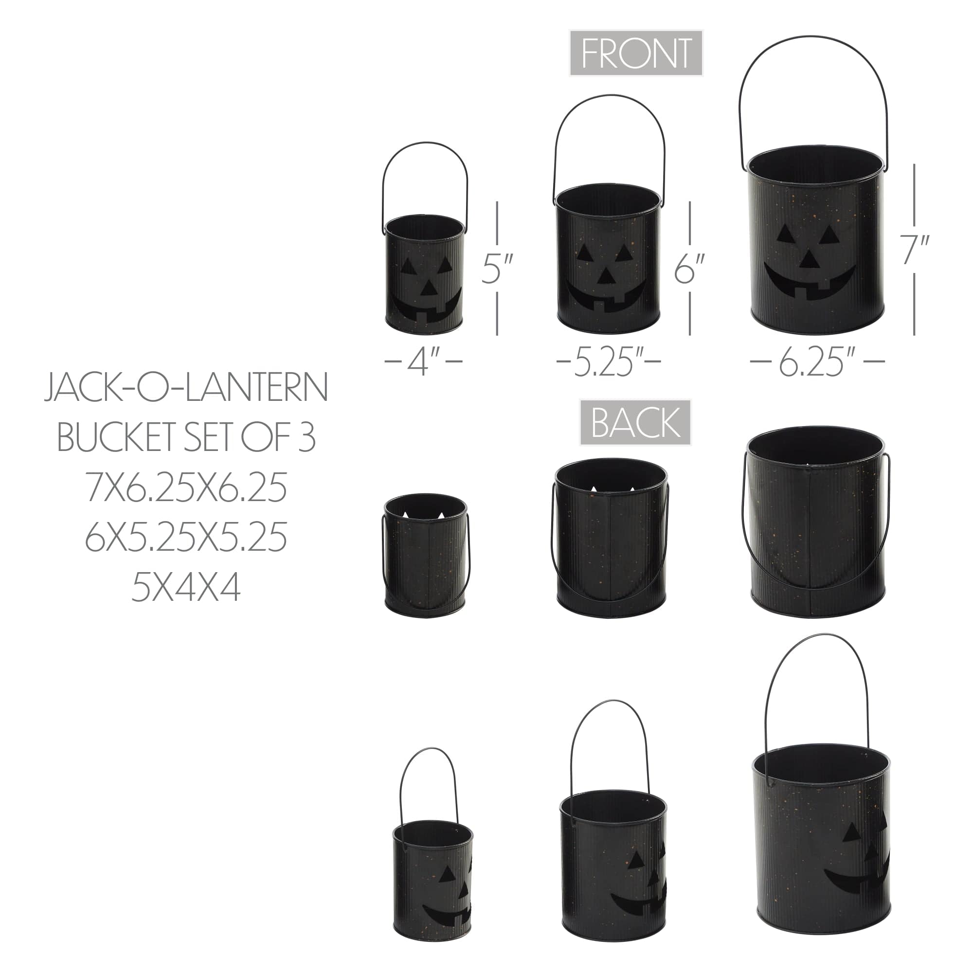Add a spooky and charming touch to your Halloween and fall decor with the VHC Brands Jack-O-Lantern Bucket Set of 3. These adorable tealight holders come in three sizes-5, 6, and 7 inches-and feature a classic bucket design with carry handles. Each bucket is adorned with a cut-out Jack-O-Lantern face, letting the candlelight shine through and create a playful glow. The ribbed texture and two-tone finish, with a deep black base and rust-brown speckled accents, add character and depth to your Halloween display. Crafted from durable metal, these candle holders have a rustic and primitive appeal, perfectly complementing your fall and Halloween decor. The combination of deep black and rust-brown colors gives them a vintage, distressed look that fits seamlessly into country, farmhouse, or rustic-themed interiors. Whether used together as a set or displayed individually, these lanterns bring a whimsical yet eerie vibe to your kitchen, dining room, entryway, or living room. The VHC Brands Jack-O-Lantern Bucket Set of 3 is easy to maintain with a soft cloth wipe. However, it is important to follow safety precautions-do not touch or move the holders while they are warm or when the candle is lit. Allow the holders to cool before handling and always keep them out of reach of children and away from flammable objects. Candles are not included, but these delightful Jack-O-Lantern buckets will add a spooky and festive glow to your Halloween decorations for years to come.