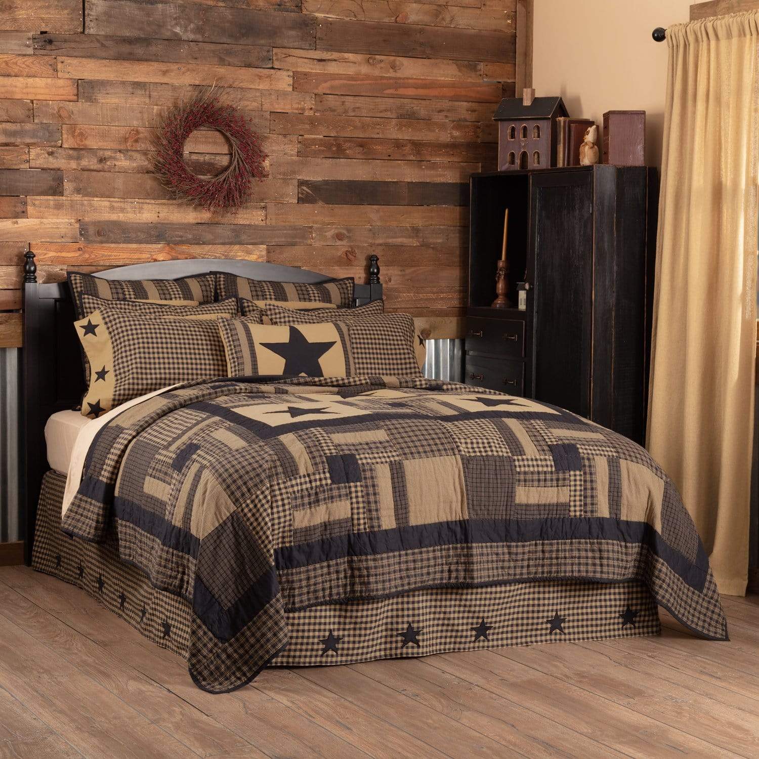 The Black Check Star Queen Quilt is sure to create a warm, country, primitive feel to any room contains stitch in the ditch hand quilting on various black and tan check pattern, plaid, and solid features 5 point star confetti block patches accented with solid and check fabric borders 100% cotton