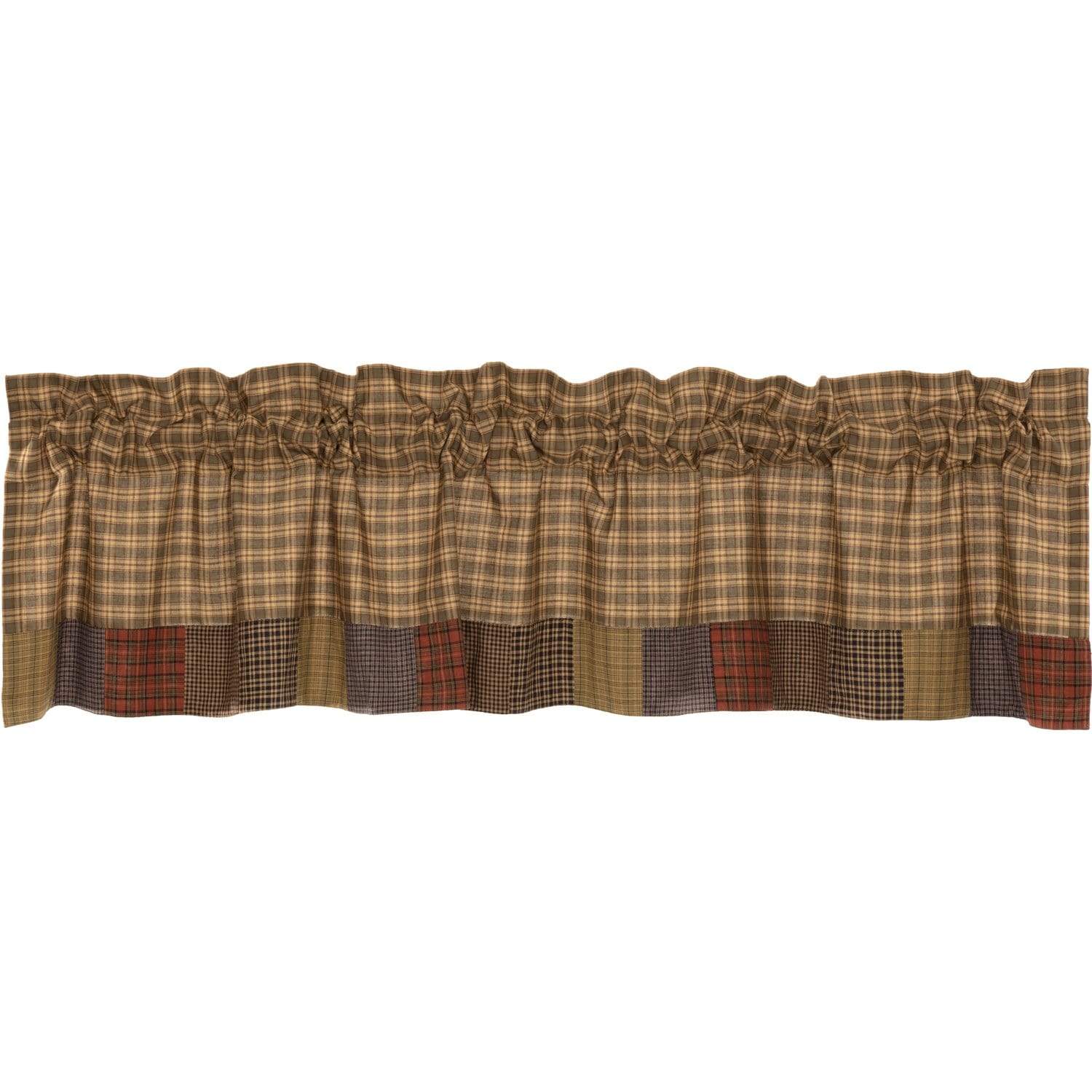 With rich texture and unique design, the Cedar Ridge Valance Block Border 16x72 brings a raw and relaxed, lodge inspired look into your home. Effortlessly coordinating with Cedar Ridge Quilts, this rustic curtain features cedar green, tan, and dark brown country plaid  finished with a block boarder in cedar green, brick red, and navy plaid and checks.