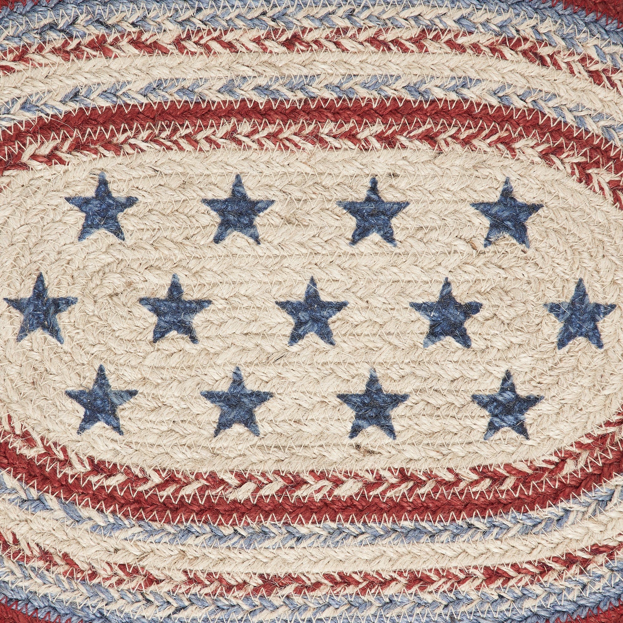 - Americana Decor Placemat - Our Celebration Jute 10x15 inch Oval Placemat features alternating solid and mixed braids in a patriotic color palette with stenciled blue stars in the center.