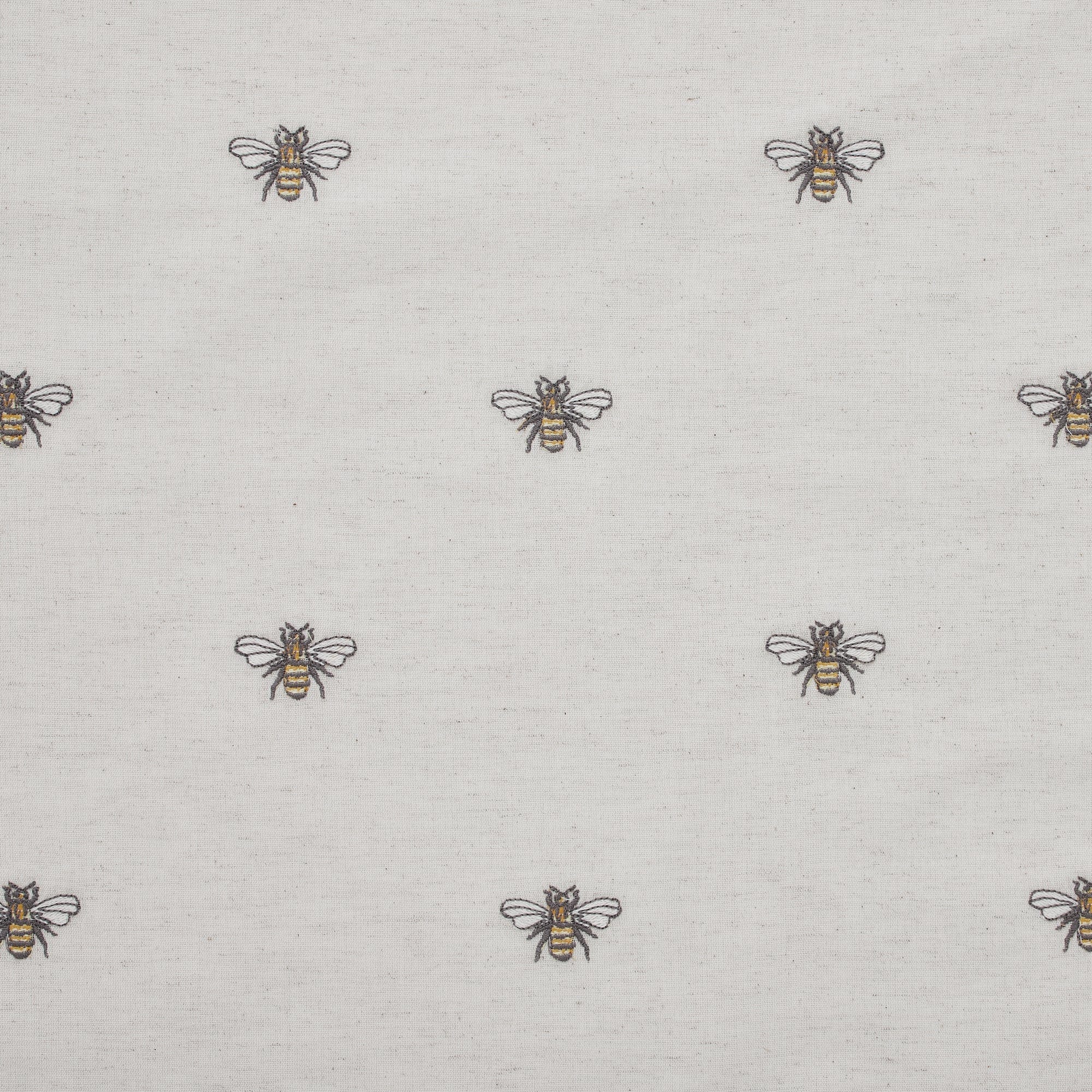 Our 16x72 inch Embroidered Bee Valance features a textured, cotton flax base fabric with bee embroidery in natural creme, soft yellow, and charcoal grey. Constructed with 100 percent cotton lining and includes both rod pocket and fabric loop hanging options.